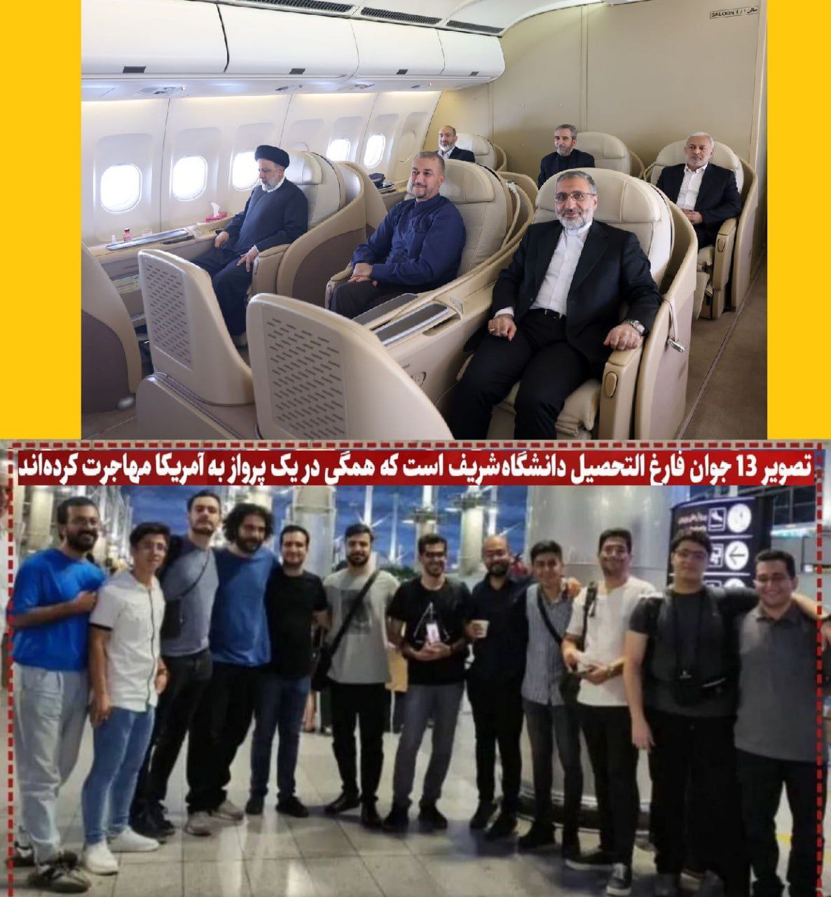 عکس پایین سیزده نخبه که میلیاردها هزینه انها ازکیسه ملت شده حاصل تلاش علمی خود وده ها استاد نخبه و عکس بالاهیات دولتی است که می روندتا زودبر گردند!