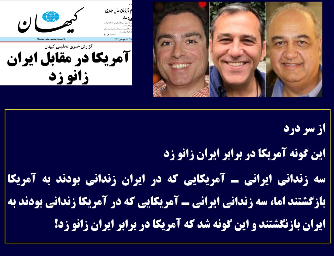 از سر درد این گونه آمریکا در برابر ایران زانو زد سه زندانی ایرانی ـ آمریکایی که در ایران زندانی بودند به آمریکا بازگشتند اما، سه زندانی ایرانی ـ آمریکایی که در آمریکا زندانی بودند به ایران بازنگشتند و این گونه شد که آمریکا در برابر ایران زانو زد!........پول خودمون به خودمون دادند هرکدام هم سهمشون برداشتند زندانی ها هم آزاد شدند وقطر هم حالی داره میکنه  [ پنجشنبه ۳۰ شهریور ۱۴۰۲ ]  [ 9:18 PM ]  [ اسیر6155 ]