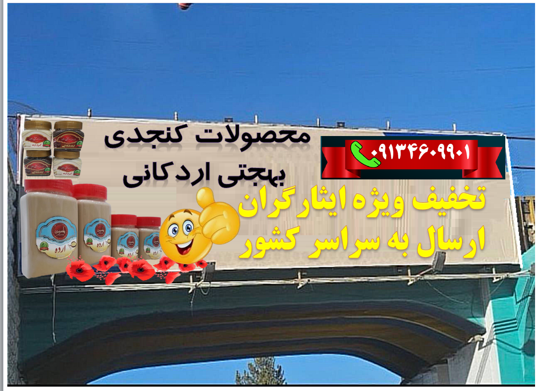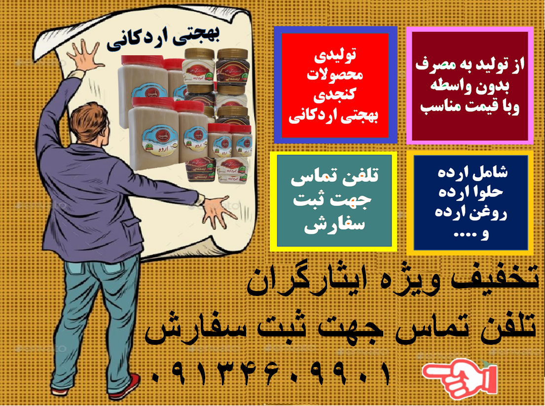 تولیدی محصولات کنجدی بهجتی اردکانی (از خانواده آزاده وجانباز موسوی) تولید و عرضه انواع محصولات کنجدی شامل ارده؛حلواارده،روغن ارده و .... از تولید به مصرف بدون واسطه وبا قیمت مناسب. تخفیف ویژه ایثارگران تلفن تماس جهت ثبت سفارش 09134609901 [ جمعه ۲۷ بهمن ۱۴۰۲ ] [ 9:56 AM ] [ اسیر6155 ]