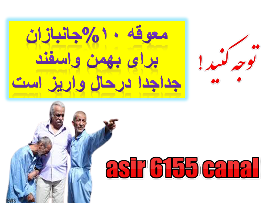 قابل توجه جانبازان ماده 38 حالت اشتغال پیامک های واریزی جدا جدا می آید افزایش 20درصد با حقوق واریز شده جانبازانی که تاحالا پیامک دریافت نکرده اند نگران نباشند تا امروز همه واریزی ها انجام میشه پس 20 درصد سالیانه باحقوق و10درصد معوقه جدا واریز می شود اسیر 6155