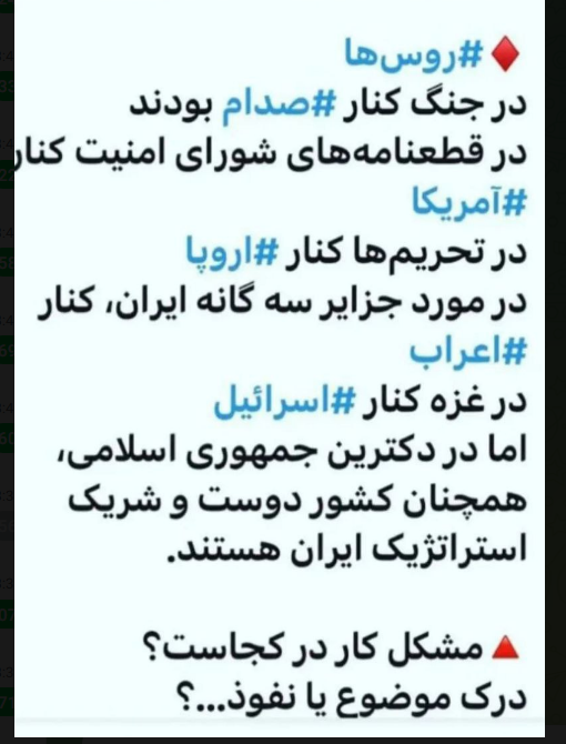 نویسنده:کریمی یکشنبه ۲۶ فروردین ۱۴۰۳ ساعت: ۱۸:۴۰ نمی دانم چرا احمق نتانیاهو تازمانی که امثال شما وجناب رحیم قمشی را داره خودش را به آب و آتش می زنه؟! /////////////////// نویسنده:فرزند آزاده دوشنبه ۲۷ فروردین ۱۴۰۳ ساعت: ۱۴:۳ عمو کریمی سلام عمو شما که ماشالله سن وسالی از ت گذشته هنوز نفهمیدی چرا نتانیاهو احمق اصلا نیاز نداره که خودشو به اب وآتیش بزنه تمام مدارک واطلاعات توسط نفوذی ها ومسوولان خائن دریافت کرده عمو جان تودلت خوش نباشه به این قمپز درکردن موشک ها خیلی کشورها بهتر از این ها هم دارند وجارنمی زنند برای من جای سواله که سیصدتا موشک وپهپاد کجا خورده که حتی یک نفر خون دماغ نشده پدر من پول دارو ندارد حالا تریلیون دلار دود هوا رفت بگو فایده اش چیست عموجان شما اگر جانباز و آزاده ای که بعید میدانم نباید عاشق جنگ افروزی باشید جنگ یعنی ویرانی یعنی دربدری یک نابودی شهرها نابودی نسل ها نابودی امیدها عمو جان ما تفکرمان با شماها زمین تا اسمان است ما دیگه هیچ چیز را چشم بسته نمی پذیرم مثل شماها نبودیم که بهشت را پشت میدون مین ادرس میدادند عموجان این حق من جوان وحق مردم ایران است یکی از این سرداران بیایند سیر تا پیاز عملیات را برای مردم با تمام هزینه هایش ونتایجش را تشریح کنند بقول اون دوست مون اول به آمریکا بگی ما می زنیم شما به اسراییل بگویید نزند درست مثل عین الاسد دیگه فخر ندارد اقتدار نظام دل های مردم است موشک ها مگسانی هستندکه در برابر عقاب دل های ملت به چشم هم نمیایند.درود برگردانندگان این وبلاگ که حقایق را بیان می کنند وباب دل جوانان ونسل امروزند من از ادمین های جوان این سایت می خواهم نظرم را در صفحه اول قرار دهند وهمچنین نظر اقا کریمی /////
