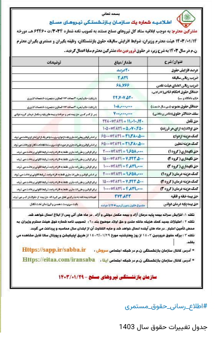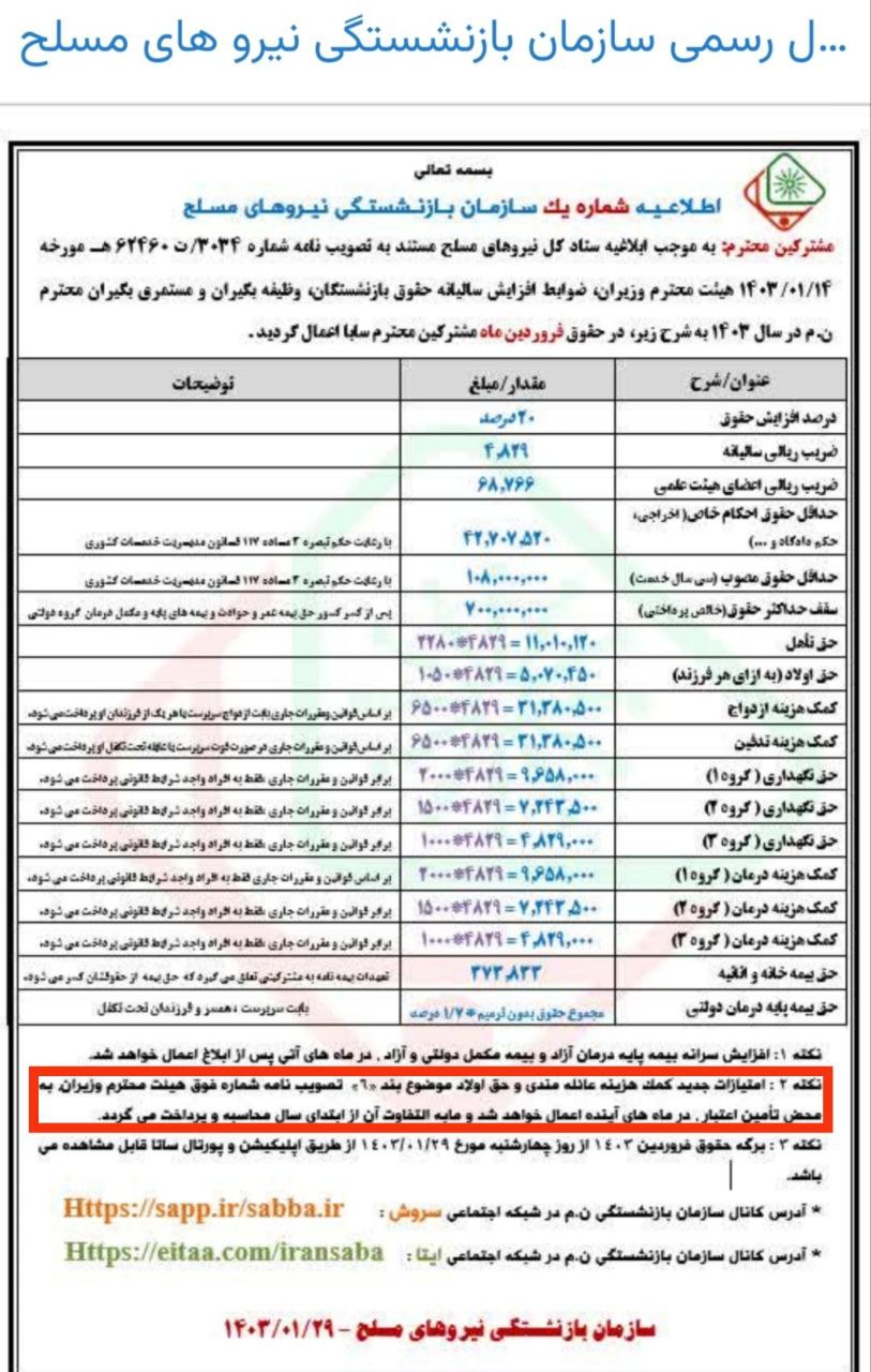 * به موجب ابلاغیه ستاد کل نیروهای مسلح مستند به تصویبنامه هیأت محترم وزیران، افزایش حقوق بازنشستگان، وظیفه بگیران و مستمری بگیران ن.م در سال 1403 به شرح زیر اعمال گردید: الف) افزایش حقوق به میزان 20 درصد نسبت به آخرین حکم حقوق سال 1402. ب) افزایش ضریب ریالی سالانه از 4024 به 4829 . پ) افزایش ضریب ریالی اعضای هیئت علمی از 57305 به 68766 . ت) اطلاعات تکمیلی در خصوص میزان افزایش مزایا ( حق همسر، حق اولاد و ... ) در پورتال ساتا به آدرس الکترونیکی: www.esata.ir و کانال سروش سازمان به آدرس :Https://sapp.ir/sabba.ir و کانال ایتا سازمان به آدرس: Https://eitaa.com/iransaba اطلاع رسانی شده است. در ضمن افزایش سرانه بیمه پایه درمان آزاد و بیمه مکمل درمان دولتی و آزاد در ماه های آتی پس از ابلاغ، اعمال و اطلاع رسانی خواهد شد. [ چهارشنبه ۲۹ فروردین ۱۴۰۳ ] [ 9:52 AM ] [ اسیر6155 ]