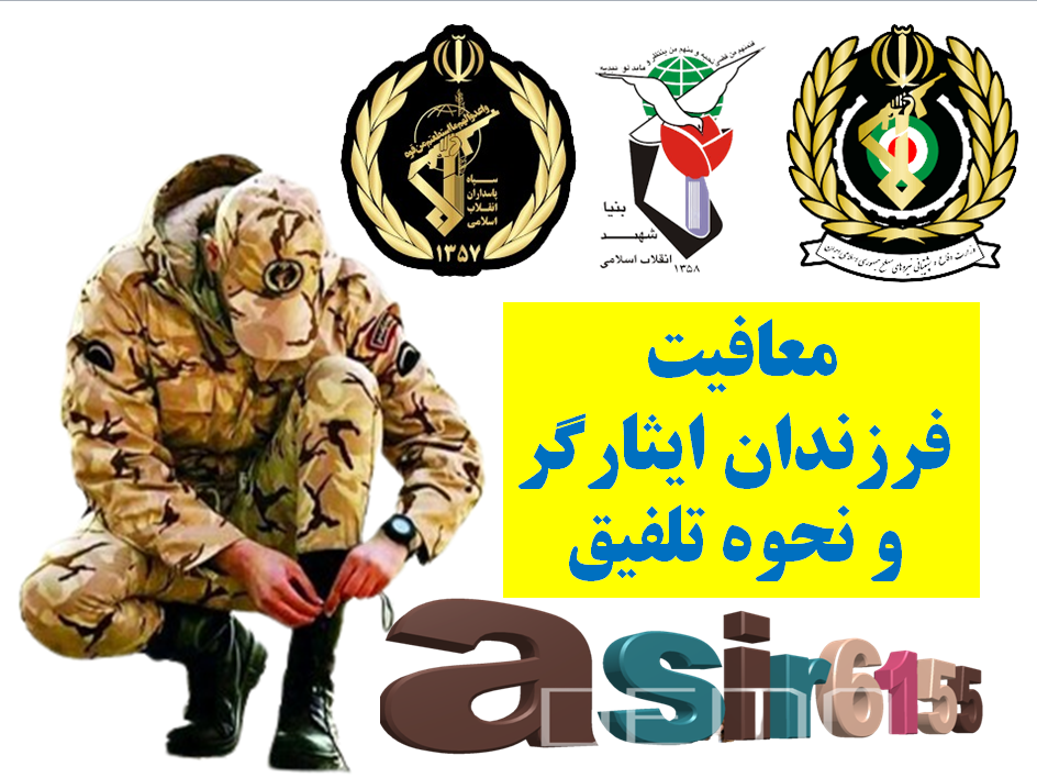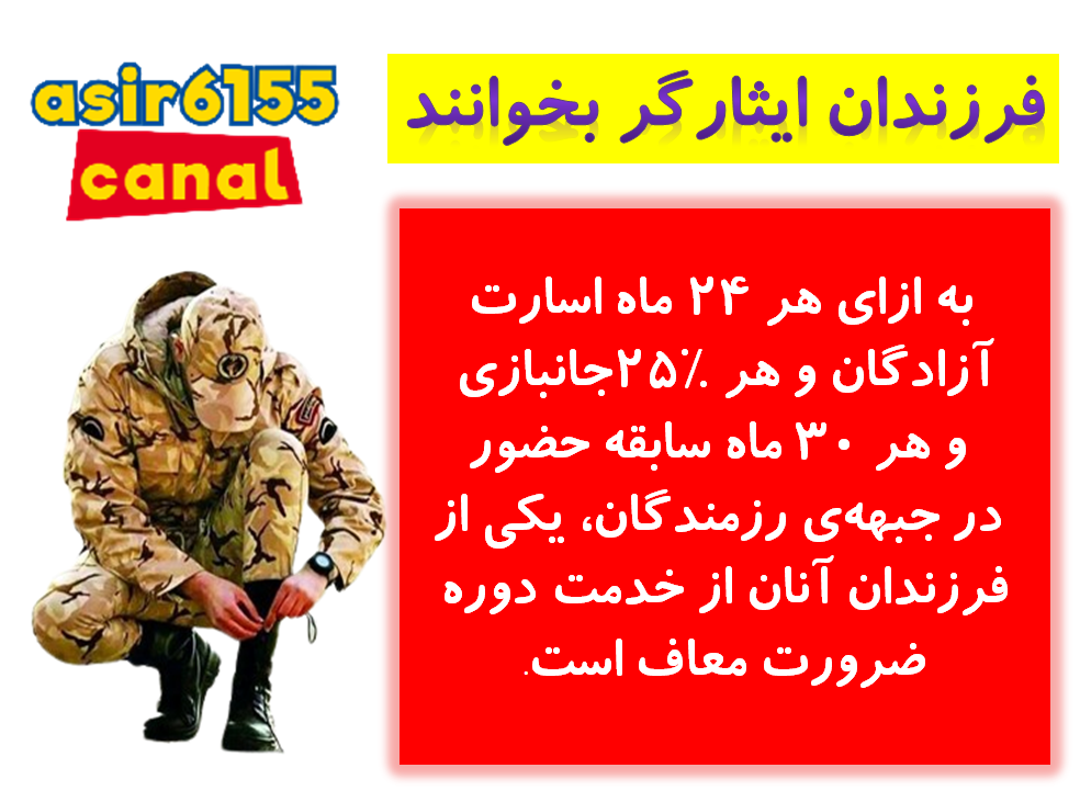 ۱- به ازای هر ۲۴ ماه اسارت آزادگان و هر ۲۵%جانبازی و هر ۳۰ ماه سابقه حضور در جبههی رزمندگان، یکی از فرزندان آنان از خدمت دوره ضرورت معاف است. محدودیت نداشته و متناسب با امتیازات فرزندان ایثارگران میتوانند از خدمت دوره ضرورت معاف شوند. مدت ۵۰ ماه سابقه آزادگی و ۶۰% جانبازی درصورت داشتن فرزندان متعدد ۶ فرزند وی بشرح زیر ازخدمت معاف خواهندشد: و شامل برادران آنها نمیگردد. [ چهارشنبه ۲۹ فروردین ۱۴۰۳ ] [ 1:21 PM ] [ اسیر6155 ]