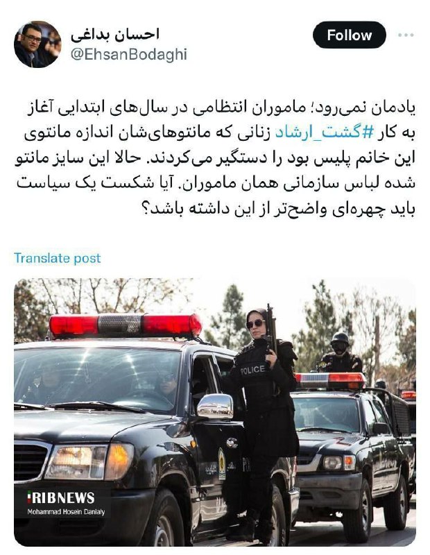 احسان بداغی: یادمان نمیرود؛ ماموران انتظامی در سالهای ابتدایی آغاز به کار گشتارشاد زنانی که مانتوهایشان اندازه مانتوی این خانم پلیس بود را دستگیر میکردند. حالا این سایز مانتو شده لباس سازمانی همان ماموران. آیا شکست یک سیاست باید چهرهای واضحتر از این داشته باشد؟