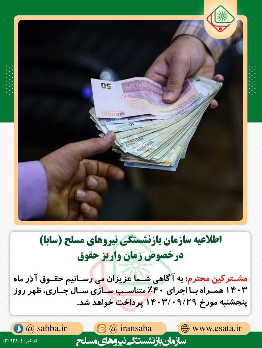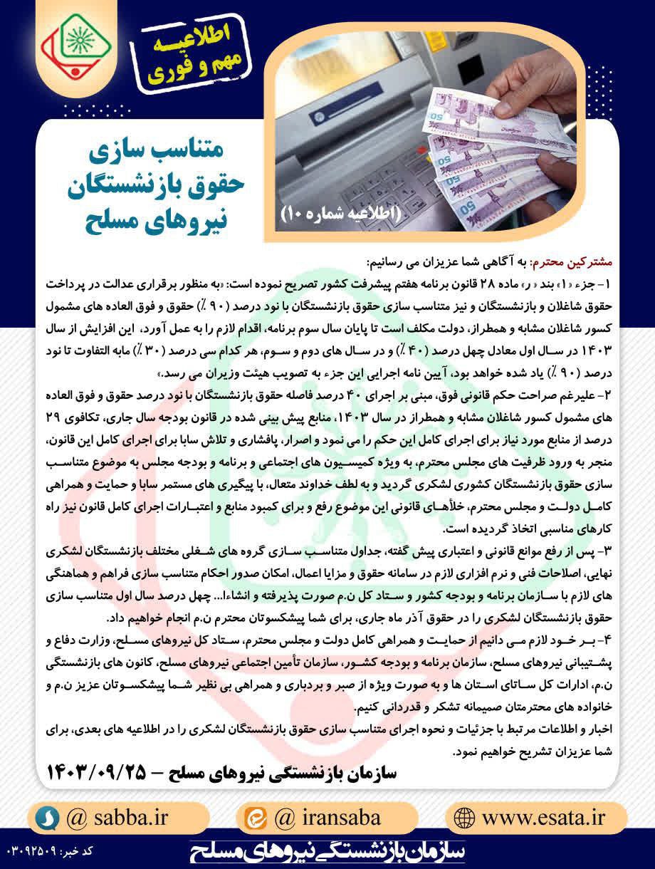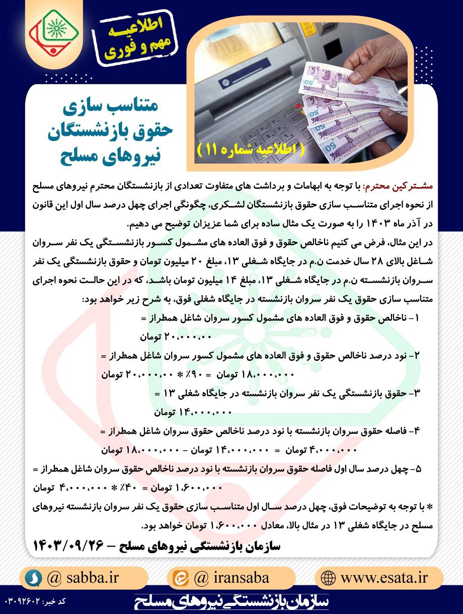 بازنشستگان نیروهای مسلح ( اطلاعیه شماره ۱۳ ) 🔸مشترکین محترم به آگاهی شما عزیزان می رسانیم چهل درصد سال اول متناسب سازی حقوق بازنشستگان نیروهای مسلح بر اساس ضوابط زیر در حقوق آذر ماه شما پیشکسوتان معزز ن.م محاسبه و پرداخت گردیده است: سازمان بازنشستگی نیروهای مسلح - ۱۴۰۳/۰۹/۲۹ #متناسب_سازی_حقوق  [ جمعه ۳۰ آذر ۱۴۰۳ ]  [ 11:25 AM ]  [ اسیر6155 ]