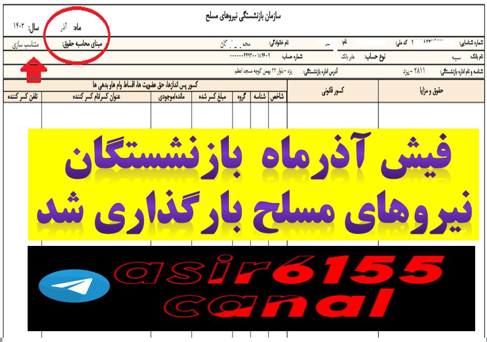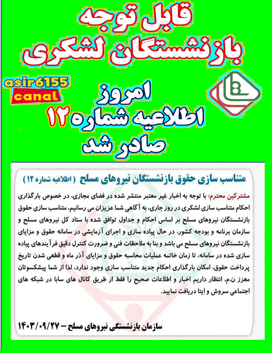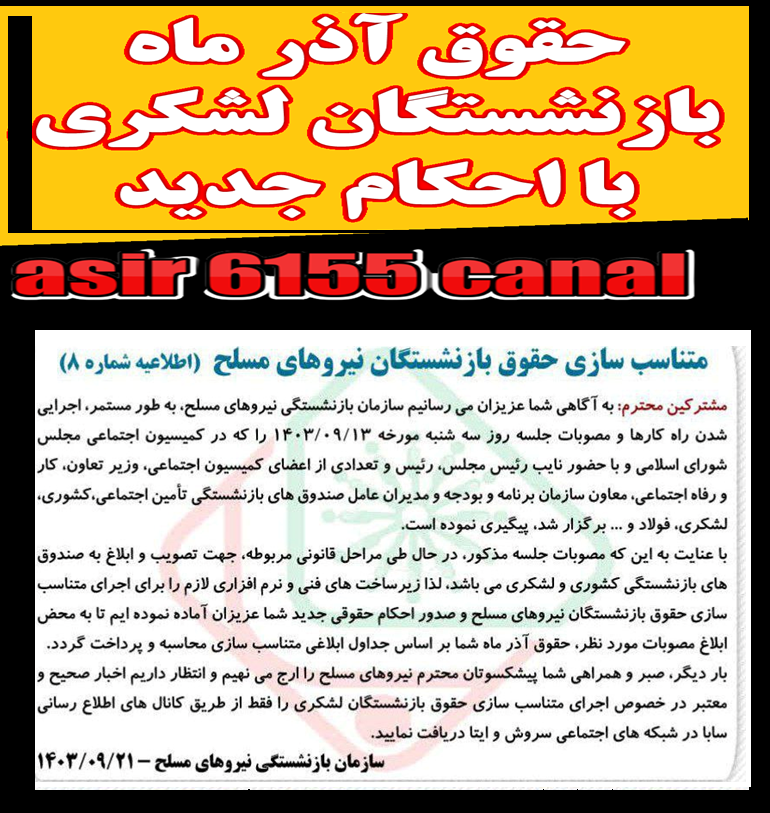 #اطلاعیه با توجه به ابهامات زیاد شما عزیزان اطلاعیه شماره ۱۴ سازمان بازنشستگی نیروهای مسلح با موضوع تشریح جزئیات بیشتری از ارتباط ترمیم حقوق بهمن ۱۴۰۲ و متناسب سازی آذر ۱۴۰۳ در ساعت ۱۴:۰۰ روزشنبه مورخه ۱۴۰۳/۱۰/۰۱ در کانال های سروش و ایتای سابا بارگذاری خواهد شد  [ جمعه ۳۰ آذر ۱۴۰۳ ]  [ 8:34 PM ]  [ اسیر6155 ]