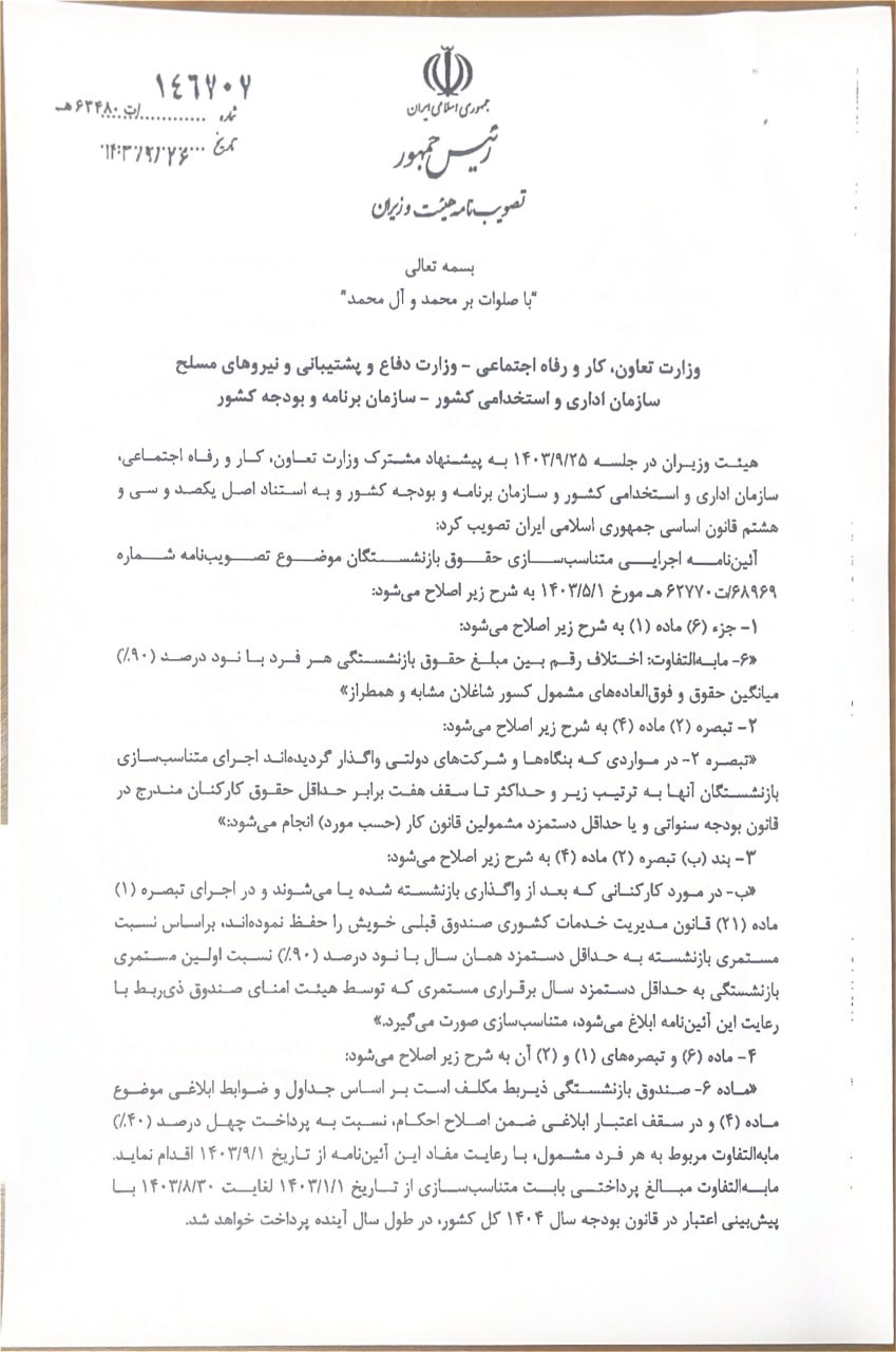 * ﺑﺮ ﺍﺳﺎﺱ ﺗﺼﻮﯾﺐ ﻧﺎﻣﻪ ﺷﻤﺎﺭﻩ 68969/ﺕ 62770 ﻫـ ﻣﻮﺭﺥ 01/05/1403 ﻫﯿﺌﺖ ﻣﺤﺘﺮﻡ ﻭﺯﯾﺮﺍﻥ ﻭ ﺍﺻﻼﺣﺎﺕ ﻭ ﺍﻟﺤﺎﻗﺎﺕ ﺑﻌﺪی ﺁﻥ ﻭ ﻣﺼﻮﺑﺎﺕ کﻤﯿﺘﻪ ﺗﻠﻔﯿﻖ ﻭ ﺍﻣﻮﺭ ﺣﻘﻮﻕ ﻧﯿﺮﻭﻫﺎی ﻣﺴﻠﺢ، ﻣﺮﺣﻠﻪ ﺍﻭﻝ ﻣﺘﻨﺎﺳﺐ  [ جمعه ۳۰ آذر ۱۴۰۳ ]  [ 1:39 PM ]  [ اسیر6155 ]
