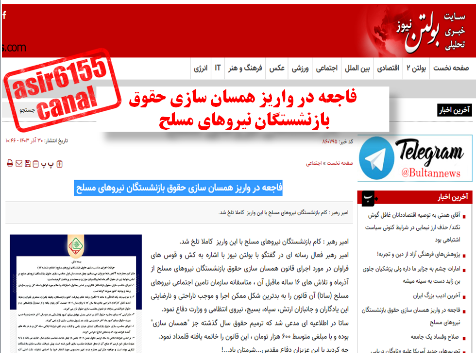 فاجعه در واریز همسان سازی حقوق بازنشستگان نیروهای مسلح امیر رهبر : کام بازنشستگان نیروهای مسلح با این واریز کاملا تلخ شد.