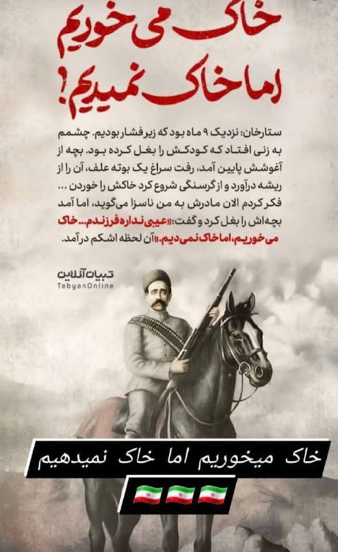 ستارخان در خاطراتش میگه من هیچوقت گریه نکردم چون اگر گریه می کردم آذربایجان شکست می خورد و اگر آذربایجان شکست می خورد ایران شکست می خور اما یک بار گریستم و آن زمانی بود که ۹ ماه بدون آب و غذا در محاصره بودیم؛ از قرارگاه آمدم بیرون، مادری را دیدم با کودکی در بغل؛ کودک از فرط گرسنگی به سمت بوته علفی رفت و بدلیل ضعف شدید بوته را با خاک ریشه خورد. با خودم گفتم الان مادر کودک مرا ناسزا میدهد و میگوید لعنت به ستارخان. اما مادر، فرزند را در آغوش گرفت و گفت: "اشکالی نداره فرزندم، خاک می خوریم، اما خاک نمی دهیم." ..................................................................